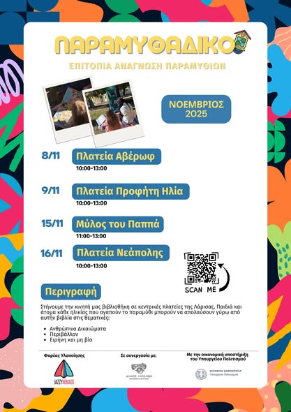 Την ομορφιά του παραμυθιού, αλλά και των βιβλίων γενικότερα θα έχουν την ευκαιρία να γνωρίσουν τα παιδιά μέσα από το “Παραμυθάδικο”. Η Αντιδημαρχία Πολιτισμού του Δήμου Λαρισαίων και οι Jazzy Nomads φέρνουν τα βιβλία εκεί όπου τα παιδιά παίζουν και συναντιούνται, καλλιεργώντας την ενεργή συμμετοχή τους στα κοινά. Μέσα από δραστηριότητες όπως η επιτόπια ανάγνωση βιβλίων και τα διαδραστικά εργαστήρια, τα παιδιά ευαισθητοποιούνται και εμπλέκονται δημιουργικά σε σύγχρονα κοινωνικά ζητήματα.
